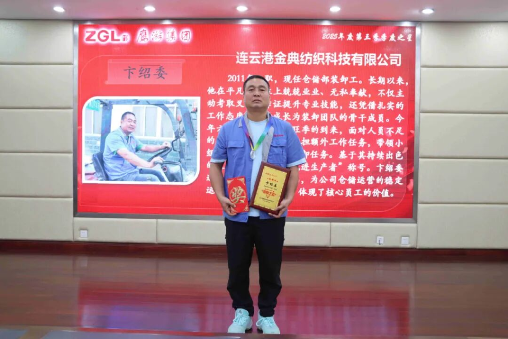 卞紹委,2011年加入金典紡織科技公司,現任倉儲部裝卸工。他積極進取,主動考取叉車操作證,提升專業能力,逐步成長為裝卸團隊的骨干。工作中,主動承擔額外任務,帶頭攻堅,帶領小組高效完成繁重裝卸工作,每日加班無怨無悔,有力保障了生產連續性,體現出顯著的模范帶頭作用。因其持續出色的表現,多次獲評“先進生產者”稱號。