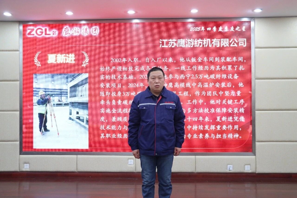 夏新進,2002年入職江蘇鷹游紡機公司,現(xiàn)任裝配車間操作工。他先后扎根鈑金、裝配車間一線,積累扎實技術功底。2020年,他遠赴海拔超2500米的高原,參與西寧2.5 萬噸碳纖維設備安裝項目。2024年完成神鷹高模線中高溫爐安裝后,隨即投身 3萬噸碳纖維設備工程,牽頭負責碳絲車間主體設備安裝。從業(yè)二十四載,他憑借過硬技術與責任擔當,在重點項目中彰顯一線技術人員的專業(yè)素養(yǎng)。