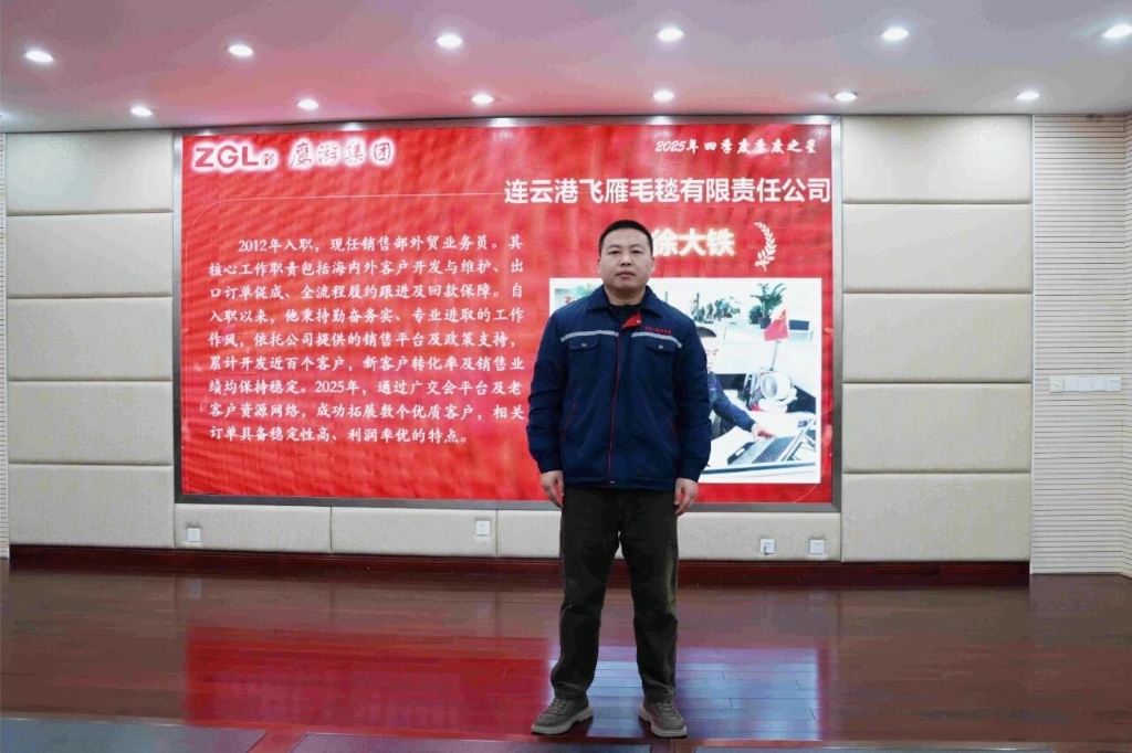 徐大鐵,2012年入職飛雁毛毯公司,現(xiàn)任銷售部外貿業(yè)務員,負責海內外客戶開發(fā)維護、出口訂單促成、全流程履約跟進及回款保障。入職以來,他秉持勤奮務實、專業(yè)進取的作風,依托公司平臺與政策支持,累計開發(fā)近百個客戶,新客戶轉化率與銷售業(yè)績穩(wěn)居高位。2025年,他借力廣交會平臺及老客戶資源網絡,成功拓展多個優(yōu)質客戶,相關訂單穩(wěn)定性高、利潤率優(yōu),為公司2026年持續(xù)生產提供有力訂單支撐。