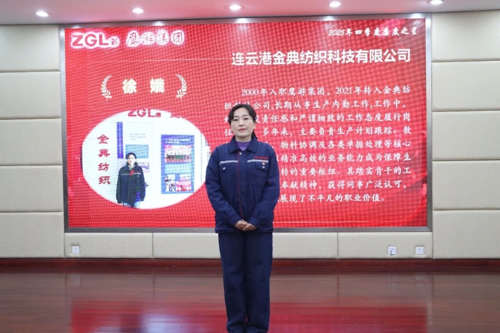 徐娥,中共黨員,2000年入職鷹游集團,2021年轉入金典紡織科技公司,長期深耕生產內勤崗位。她秉持高度責任感與嚴謹細致的工作態(tài)度,負責生產計劃跟蹤、數據統(tǒng)計匯總、物料協(xié)調及單據處理等核心事務,憑借對生產全流程的熟悉和出色的溝通協(xié)調能力,精準對接各部門需求,保障信息流與物流暢通,成為生產一線高效運轉的堅實后盾,其踏實肯干、敬業(yè)奉獻的作風贏得同事廣泛認可。